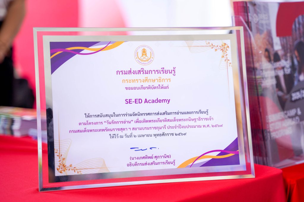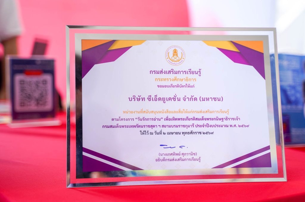 บริษัท ซีเอ็ดยูเคชั่น จำกัด (มหาชน) ได้รับมอบเกียรติบัตรจากกรมส่งเสริมการเรียนรู้ กระทรวงศึกษาธิการ ในฐานะหน่วยงานที่มีบทบาทสำคัญในการสนับสนุนการเรียนรู้ ในงานเทิดพระเกียรติ “เจ้าฟ้านักอ่าน” สมเด็จพระกนิษฐาธิราชเจ้า กรมสมเด็จพระเทพรัตนราชสุดาฯ สยามบรมราชกุมารี ซึ่งจัดขึ้นเนื่องในกิจกรรม “วันรักการอ่าน” ประจำปี 2569 ภายใต้แนวคิด “อ่านเปลี่ยนชีวิต” ณ ศูนย์ส่งเสริมและพัฒนาการเรียนรู้ทางวิทยาศาสตร์ (ท้องฟ้าจำลองกรุงเทพ)