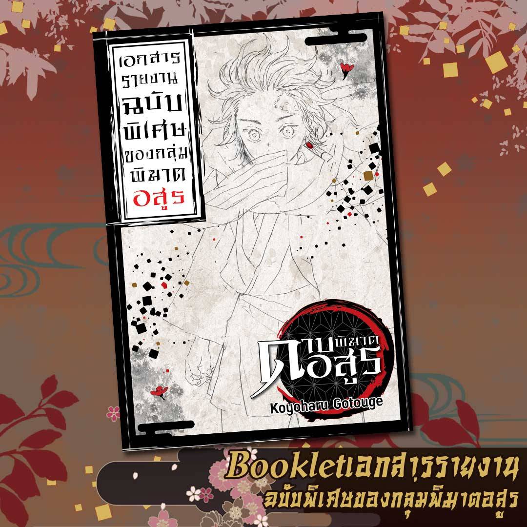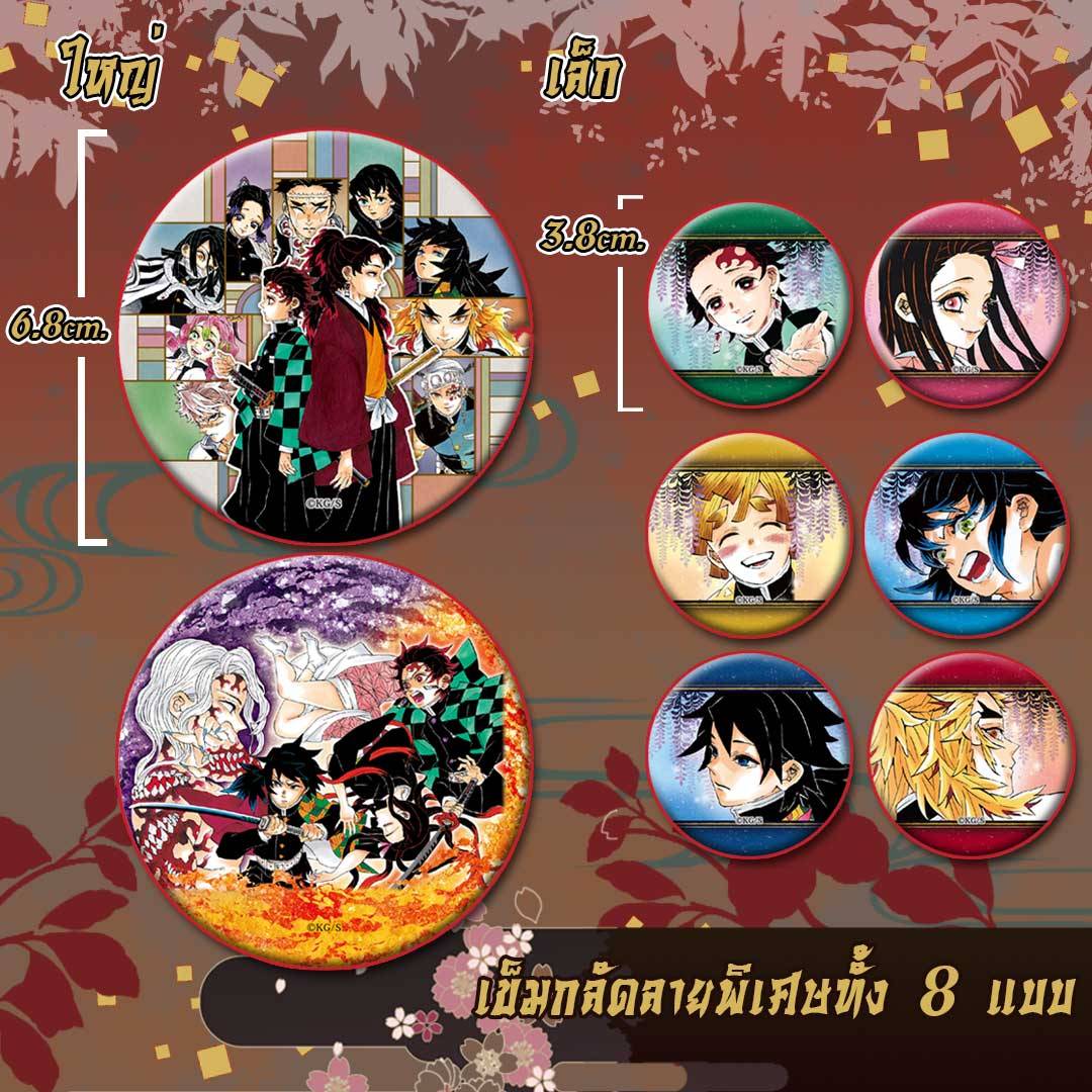 - พิเศษ!รับฟรี PREMIUM SET เข็มกลัดลายพิเศษ 8 ชิ้น (ใหญ่ 2 ชิ้น / เล็ก 6 ชิ้น) และ เอกสารเนื้อหาเสริม (Booklet) ภาคผนวกของตำนาน ดาบพิฆาตอสูร